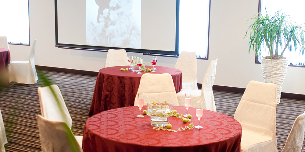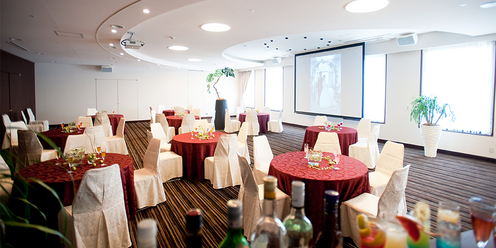 天井壁面は白ベースで、後面とカーペットはダークブラウンの落ち着いた色調で クラシカルなパーティールーム。