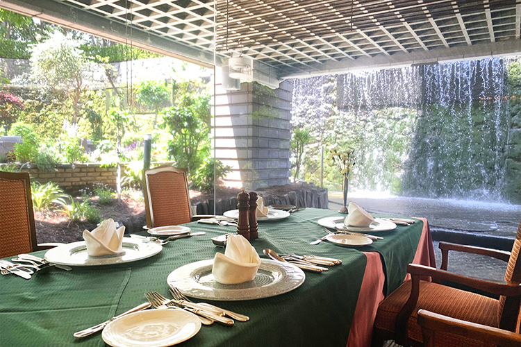 落ち着きのあるレストラン席はガラス越しに、緑豊かなガーデンと滝の流れが広がる非日常的な空間。