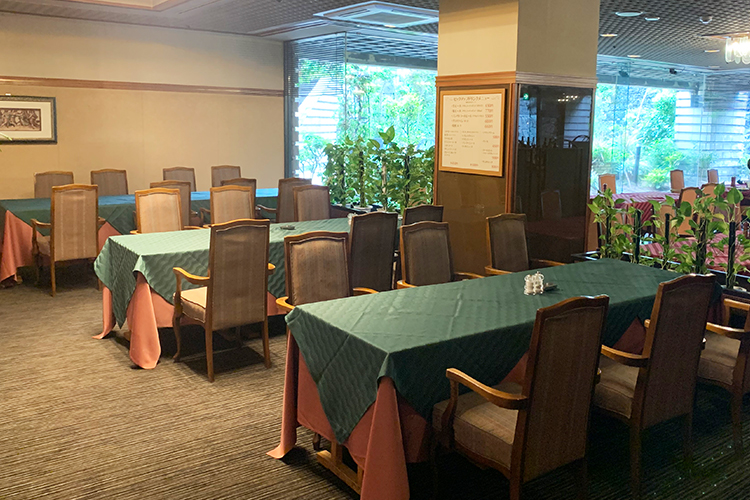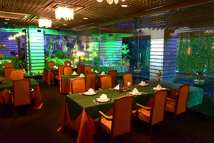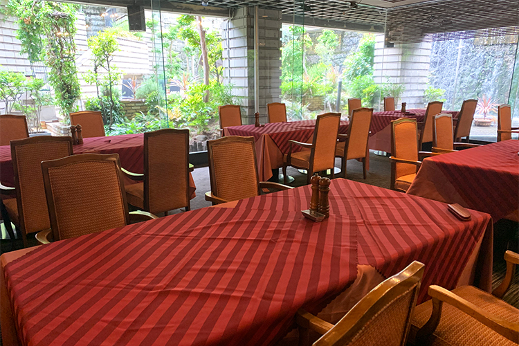 落ち着きのあるレストラン席はガラス越しに、緑豊かなガーデンと滝の流れが広がる非日常的な空間。